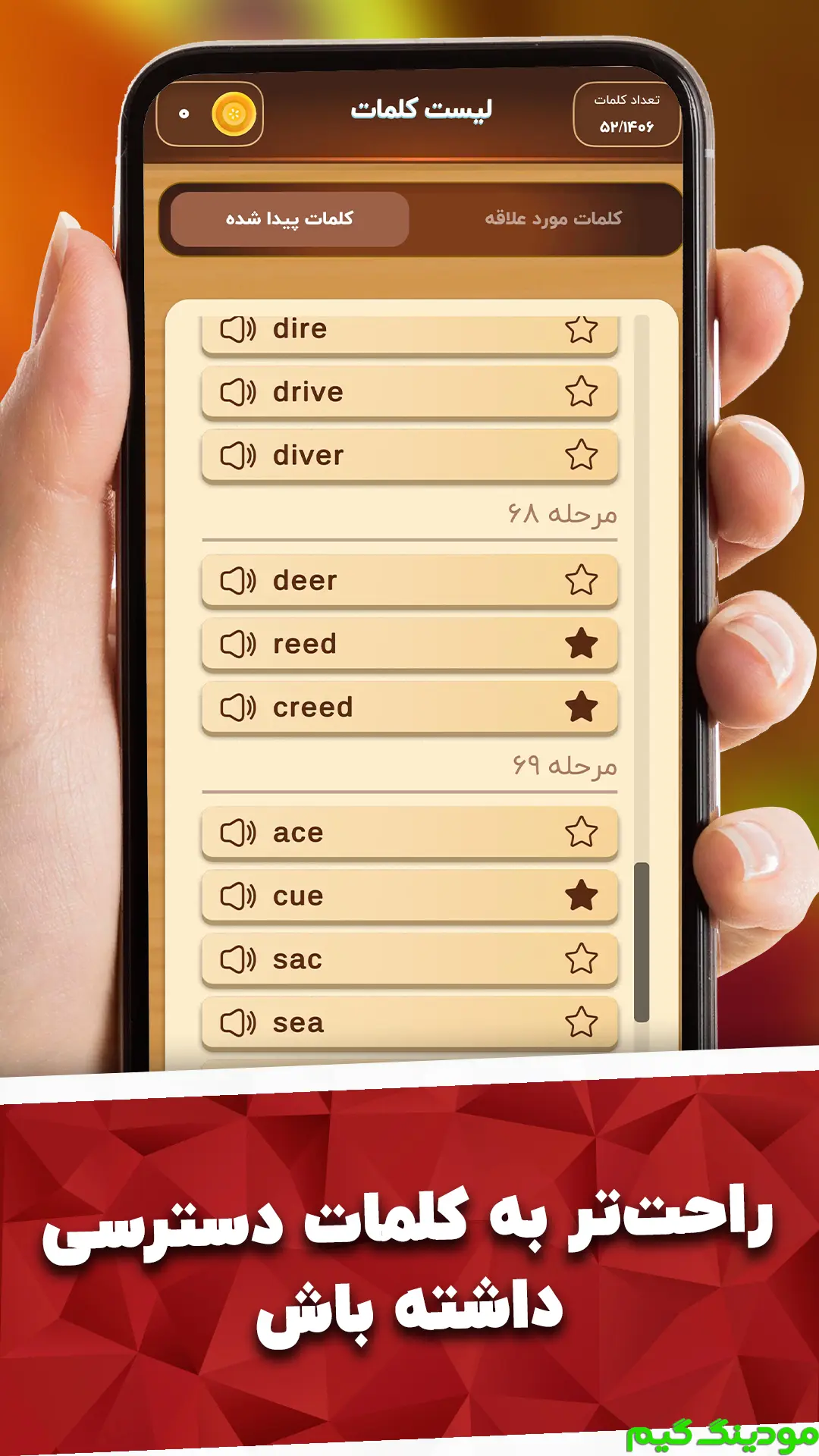 گیم پلی بازی بر پایه مکانیک ساده اما بسیار موثر حدس کلمات طراحی شده است. بازیکن با مشاهده شبکه ای از حروف، باید کلمات صحیح را با کشیدن انگشت روی حروف مناسب بسازد. این روند به ظاهر ساده، نیازمند دقت و توجه به حروف و ترتیب آن ها است و باعث تقویت مهارت های شناختی و حافظه دیداری بازیکن می شود. هر مرحله شامل مجموعه ای از کلمات مرتبط با موضوع یا سطح دشواری مشخص است و بازیکن باید تمام کلمات مرحله را حدس بزند تا به مرحله بعدی دسترسی پیدا کند.پس از هر حدس صحیح، بازیکن بازخورد فوری دریافت می کند که شامل تلفظ صوتی، ترجمه دقیق و مثال های کاربردی از کلمه در جملات واقعی است. این ویژگی باعث می شود یادگیری تنها به حفظ کردن محدود نشود و بازیکن بتواند کاربرد عملی کلمات را در متن ها و مکالمات واقعی درک کند. همچنین، ارائه بازخورد فوری موجب تثبیت بهتر دانش و افزایش انگیزه برای ادامه بازی می شود.مراحل بازی به تدریج پیچیده تر می شوند. در مراحل ابتدایی، کلمات کوتاه و رایج به بازیکن معرفی می شوند که برای کسانی که تازه با بازی و زبان انگلیسی آشنا شده اند، مناسب است. با پیشرفت در مراحل بالاتر، کلمات طولانی تر، کمتر رایج و پیچیده تر وارد بازی می شوند که نیازمند دقت و تحلیل بیشتری است. این طراحی تدریجی باعث می شود بازیکن بدون احساس فشار و یکنواختی، به یادگیری ادامه دهد و مهارت های خود را به مرور توسعه دهد.یکی از ویژگی های مهم دیگر، امکان ذخیره و مرور کلمات است. بازیکن می تواند کلمات حدس زده شده و کلمات مورد علاقه خود را ذخیره کرده و در زمان های دیگر مرور کند. این قابلیت باعث می شود یادگیری مداوم و تثبیت شده باشد و بازیکن بتواند دایره لغات خود را به طور منظم و هدفمند گسترش دهد. علاوه بر این، بازی شامل دیکشنری کامل کلمات است که ترجمه، تلفظ و کاربرد هر کلمه را ارائه می دهد، که یک منبع آموزشی جامع برای تمرین و مرور فراهم می کند.طراحی بصری و رابط کاربری بازی نیز به گونه ای است که تجربه ای روان، جذاب و بدون پیچیدگی ارائه می دهد. استفاده از رنگ های روشن، بازخوردهای تصویری واضح و فونت های خوانا باعث می شود بازیکن بتواند بدون سردرگمی و با تمرکز کامل، مراحل را پشت سر بگذارد. این ویژگی ها در کنار مکانیک ساده و هوشمندانه حدس کلمات، این اثر را به تجربه ای همزمان آموزشی و سرگرم کننده تبدیل می کند و باعث می شود بازیکن به صورت فعال در فرآیند یادگیری درگیر شود.