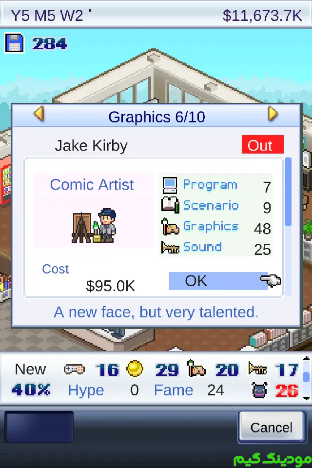 بازی Game Dev Story + Mod داستان توسعه بازیهای ویدئویی مود شده در سبک شبیه سازی توسط استودیو بازی سازی معروف و محبوب Kairosoft در مودینگ گیم به صورت رایگان برای اندروید منتشر شد.این اثر ساخته ی استودیوی ژاپنی Kairosoft، نمونه ای برجسته و کلاسیک از بازی های شبیه سازی مدیریتی است که با گیم پلی عمیق، گرافیک پیکسلی ساده و مکانیک های دقیق، تجربه ای منحصر به فرد از دنیای بازی سازی را ارائه می دهد. این بازی به بازیکنان اجازه می دهد نقش مدیر یک شرکت بازی سازی نوپا را بر عهده بگیرند و با تصمیم گیری های استراتژیک، تیم خود را مدیریت کنند، پروژه های متنوعی تولید نمایند و شرکت خود را به یکی از موفق ترین نام ها در صنعت بازی های ویدیویی تبدیل کنند. روند بازی به صورت سالانه پیش می رود و در هر سال، بازیکن می تواند پروژه های بازی سازی متعددی را شروع کند، منابع و بودجه را مدیریت کند، تیم خود را آموزش دهد و حتی با تولید کنسول اختصاصی، به رقابت با شرکت های بزرگ صنعت بپردازد.مهم ترین محور گیم پلی بازی، توسعه بازی هاست. بازیکن باید با دقت ژانر، نوع و ویژگی های بازی را انتخاب کند، چرا که هر ترکیب منحصر به فرد می تواند امتیازات متفاوتی داشته باشد و روی موفقیت در بازار تاثیر مستقیم بگذارد. بازی ها دارای شاخص هایی از جمله سرگرمی، خلاقیت، گرافیک و صدا هستند که کیفیت نهایی بازی را تعیین می کنند و بازیکن باید با مدیریت زمان، بودجه و استعداد های تیم، بهترین نتیجه ممکن را ایجاد کند. این سیستم باعث می شود هر پروژه بازی یک تجربه جدید باشد و بازیکن با هر بار شروع یک بازی، با چالش های متفاوت و فرصت های نو مواجه شود. تنوع ژانرها و انواع بازی ها نیز به این تجربه عمق می بخشد، زیرا ترکیب های مختلفی از ژانرها مانند RPG، اکشن، شبیه سازی، استراتژی و ماجراجویی می تواند سبک و موفقیت بازی را به شکل متفاوتی رقم بزند و هر بار نیازمند استراتژی های تازه ای است.کارکنان نقش محوری در موفقیت شرکت دارند و بازیکن باید برنامه ریزی دقیقی برای استخدام و ارتقای مهارت های آن ها داشته باشد. کارکنان می توانند برنامه نویس، طراح، نویسنده، صداگذار و یا در نقش های تخصصی دیگر فعالیت کنند و با آموزش و تغییر شغل، مهارت های جدید کسب کنند. هر تصمیم مدیریتی روی توانایی تیم اثر می گذارد و بازیکن با ایجاد تیمی هماهنگ و خلاق می تواند کیفیت بازی های تولیدی را به حداکثر برساند. علاوه بر این، شخصیت های ویژه و مخفی با ویژگی های منحصر به فرد وجود دارند که با استخدام آن ها، قابلیت ها و مزایای استراتژیک به تیم اضافه می شود و راه را برای خلاقیت و تنوع بیشتر در تولید بازی ها هموار می کند.بازی Game Dev Story تا به امروز بیش از 1 میلیون بار در سرتاسر دنیا توسط کاربران دانلود شد.