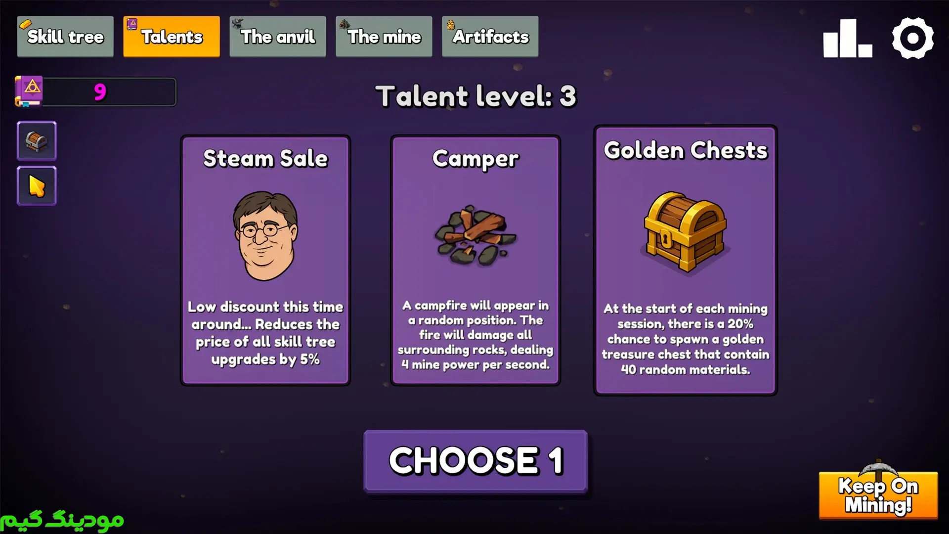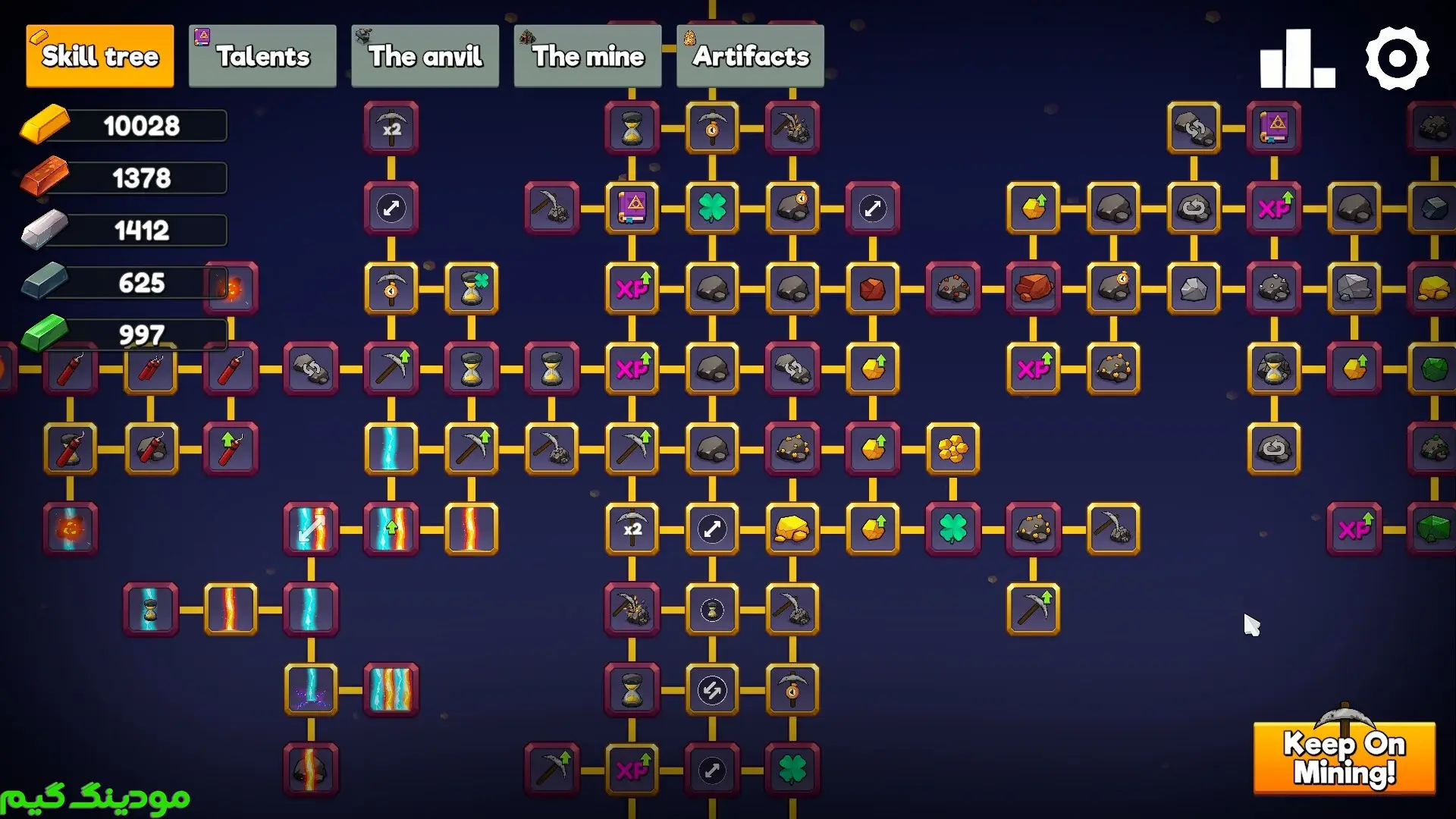 یکی از بخش های مهم بازی، سیستم ارتقا و درخت مهارت هاست که به بازیکن اجازه می دهد توانایی های خود را به صورت دائمی تقویت کند. با استفاده از منابع جمع آوری شده، میتوان قدرت استخراج، سرعت کار، محدوده تاثیر و سایر ویژگی های کلیدی را بهبود بخشید. این ارتقاها به صورت تدریجی انجام می شوند و هر کدام تاثیر ملموسی بر روند بازی دارند. همین موضوع باعث می شود بازیکن به وضوح نتیجه انتخاب های خود را ببیند و احساس کنترل و تسلط بیشتری بر روند پیشرفت داشته باشد.در کنار مهارت ها، ابزارها نیز نقش مهمی در تجربه بازی ایفا می کنند. امکان ساخت و ارتقا ابزارهایی مانند کلنگ ها وجود دارد که هر نسخه جدید، قدرت و کارایی بیشتری نسبت به قبل ارائه می دهد. استفاده از ابزارهای پیشرفته تر باعث می شود استخراج منابع سریع تر و موثرتر انجام شود و بازیکن بتواند در مدت زمان کوتاه تری به حجم بیشتری از مواد دست پیدا کند. این سیستم ساخت ابزار، حس رشد فنی و حرفه ای شدن را به خوبی منتقل می کند.با افزایش سطح تجربه، بازی لایه ی دیگری از تصمیم گیری را از طریق سیستم استعدادها به تجربه اضافه می کند.هر بار که سطح بازیکن بالاتر می رود، امکان انتخاب میان چند گزینه مهارتی فراهم می شود که هر کدام مسیر پیشرفت متفاوتی را تقویت می کنند. این انتخاب ها تصادفی هستند و همین موضوع باعث می شود هر بار بازی کردن، تجربه ای کمی متفاوت شکل بگیرد. انتخاب درست استعدادها می تواند سبک بازی را تغییر دهد و تمرکز بازیکن را روی سرعت، بهرهوری یا توسعه منابع خاصی قرار دهد.